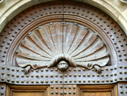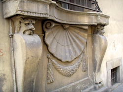finestre, una bertuccia che emerge da sotto le valve di una lignea conchiglia (a figurare il passaggio